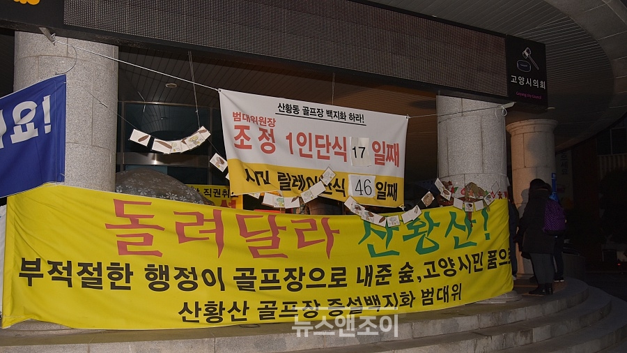 이런 절박한 상황 속에서 범대위는 마지막이라는 심정으로 12월부터 시청에서 천막 농성을 시작했다. 하지만 12월 5일, 시청 본관 입구에 설치한 텐트는 시 공무원들의 손에 파손됐고, 당시 혼자 천막을 지키던 여성 활동가 정이랑 씨는 수십 명이 지켜보는 가운데 공무원들에게 팔다리가 붙들린 채 쫓겨났다. 보다 못한 고양환경운동연합 조정 공동의장은 12월 24일부터 17일간 단식 투쟁을 하다 응급실에 실려 갔다.