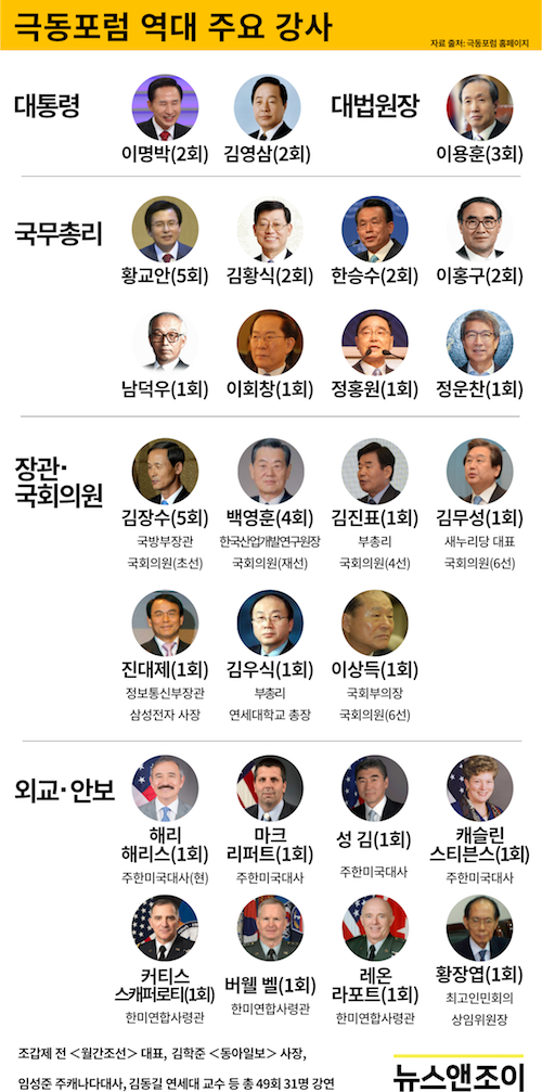 강연자로 나선 이들은 극동포럼에서 정치적 신념을 드러내기도 했다. 이회창 전 한나라당 총재는 2006년 4월 극동포럼에서, 참여정부를 강하게 비판하며 보수 결집을 촉구했다. 이 전 총재는 "2007년 대선은 분열적이고 친북적 좌파 주축 세력 대 비非좌파 세력의 대결 양상으로 갈 수밖에 없다. 자유 민주 세력이 중심이 돼 비좌파 세력의 대연합 전선을 형성해야 한다"고 말했다.