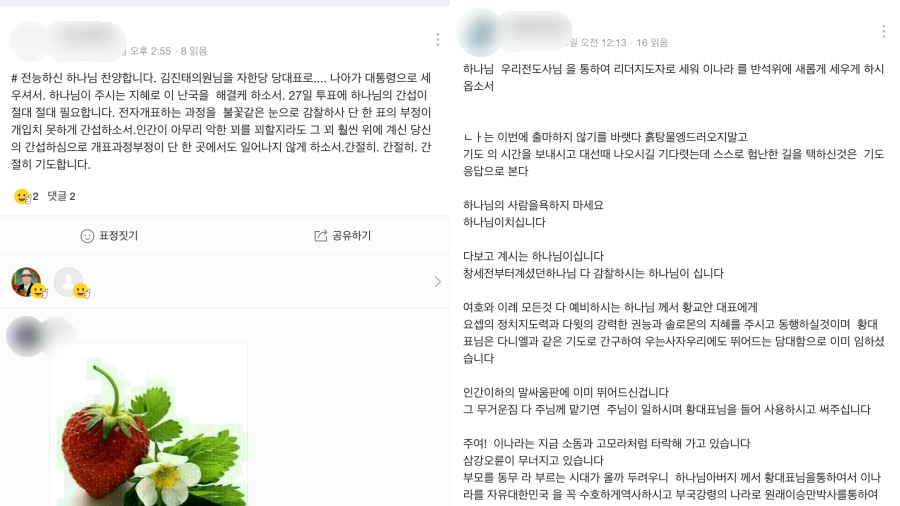 지난 2월 14일, 네이버 밴드 '황교안 팬클럽'에는 '우리 전도사님을 리더 지도자로 세워 이 나라를 반석 위에 새롭게 세우게 하시옵소서'라는 제목의 글이 올라왔다. 글을 올린 누리꾼은 "(황 전 총리가) 이번에 출마하지 않기를 바랐다. 흙탕물에 들어오지 말고 기도의 시간을 보내시고 대선 때 나오길 기다렸는데 스스로 험난한 길을 택하신 것은 기도 응답으로 본다"고 했다.