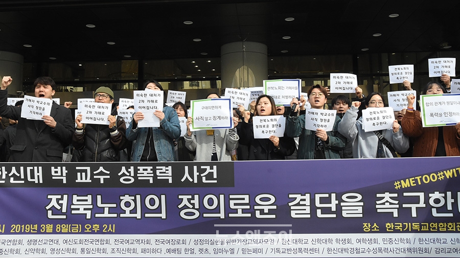 [뉴스앤조이-이은혜 기자] 한국기독교장로회(기장·김충섭 총회장) 구성원들이 한신대학교(연규홍 총장) 신학과 박 아무개 교수의 면직을 촉구하는 기자회견을 열었다. 박 교수는 제자였던 신학대학원 학생에게 성폭력을 가했다는 의혹을 받고 현재 보직에서 물러난 상태다. 박 교수의 1차 소속 기관 한신대는 매뉴얼에 따라 성윤리위원회를 구성해 그의 징계를 논의하고 있다.