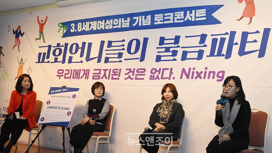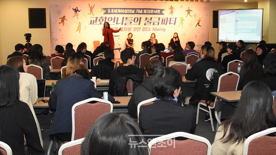 세계여성의날을 맞아 답답한 교회 현실을 나누고자 사람들이 모였다. 서울YWCA(이유림 회장)가 3월 8일 주최한 '교회 언니들의 불금 파티'에는 백소영 교수(강남대), 이은애 교수(성결대), 이주아 교수(이화여대), 김희선 교수(이화여대) 등 네 명의 '교회 언니'가 80여 명의 2030 교인들과 함께 웃고 분노하고 울었다.