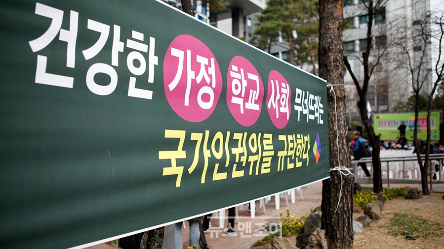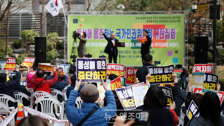 [뉴스앤조이-박요셉 기자] 동성애동성혼반대국민연합(동반연)과 동성애동성혼합법화반대전국교수연합(동반교연)이 3월 19일 서울 중구 국가인권위원회(인권위·최영애 위원장) 앞에서 규탄 집회를 열었다. 반동성애 단체 회원 200여 명은, 인권위가 최근 헌법재판소에 낙태법이 위헌이라는 의견서를 제출한 것을 놓고 "태아의 생존권을 짓밟았다"고 비판하며, 인권위 해체와 최영애 위원장 사퇴를 촉구했다.
