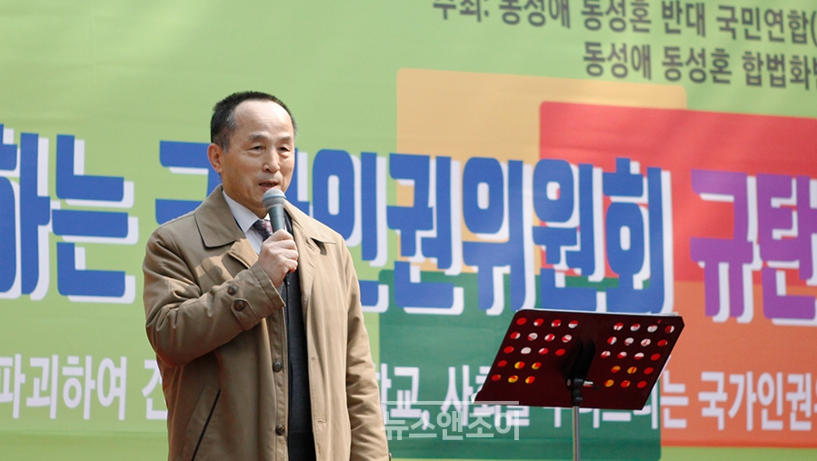 윤 목사는 참가자를 향해 나쁜 일에 앞장서고 있는 인권위를 해체해야 한다고 촉구했다. 이어서 최영애 위원장이 당장 사퇴해야 한다고 말했다. 참가자들도 손팻말을 흔들며 "해체하라", "사퇴하라"고 화답했다. 팻말에는 '동성애 옹호 중단하라', '성적 지향 삭제하라'는 글씨가 적혀 있었다.