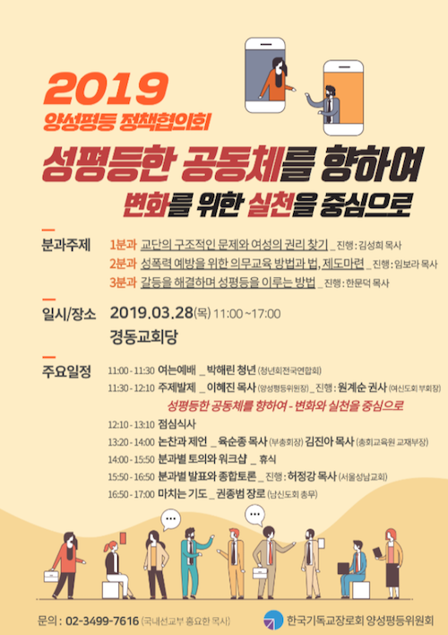 양성평등위는 3월 28일 오전 11시 경동교회에서 정책 협의회를 열 예정이다. 이들은 교회 현장에서 어떻게 성폭력 없는 성평등한 교회 공동체를 만들 수 있을지 논의한다. 이혜진 위원장이 '성평등한 공동체를 향하여 - 변화와 실천을 중심으로' 발제하고 육순종 부총회장, 총회교육원 김진아 교재부장이 논찬한다.