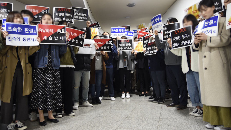 [뉴스앤조이-경소영 PD] 장로회신학대학교(임성빈 총장) 학생들이 성토했다. 대한예수교장로회 통합(림형석 총회장) 부총회장 김태영 목사(백양로교회)가 채플 설교를 위해 장신대를 찾은 4월 11일, 학생들 손에는 명성교회 세습 문제를 조속히 재판하라는 피켓이 들렸다.