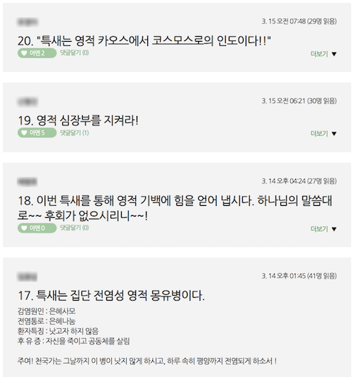 사랑의교회 교인들도 영적 지도자의 인도대로 따라간다. 장로들은 "영적 정규군이 되게 해 달라"고 기도하고, 집사들은 "영적 미세 먼지 마스크를 받았다"며 기뻐하는 것이 오늘날 사랑의교회다. 사랑의교회 특별 새벽 부흥회 홈페이지를 들어가 보면, 교인들의 창의력이 발휘된 '영적 시리즈'가 셀 수도 없이 많다.