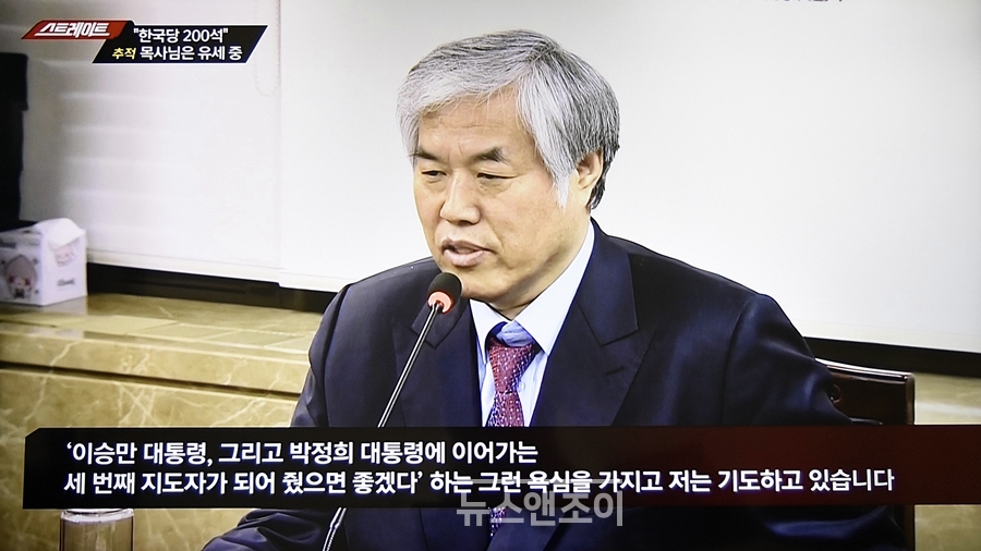[뉴스앤조이-이용필 기자] 한국기독교총연합회(한기총)를 이끌며 내년 총선을 준비 중인 전광훈 목사(사랑제일교회)가 지상파방송을 탔다. MBC 스트레이트는 5월 20일 '한국당은 200석, 목사님은 유세 중' 편을 통해 '정치 목사'로 불리는 전광훈 목사의 최근 동향을 비중 있게 보도했다.