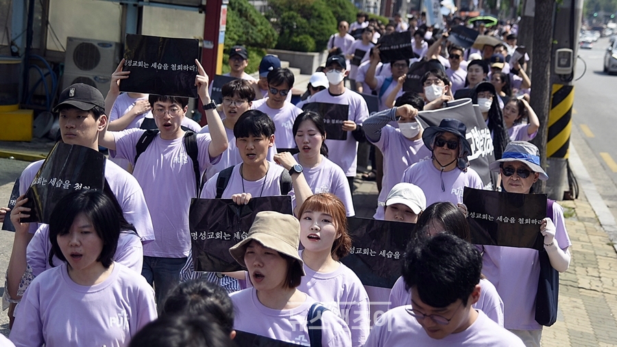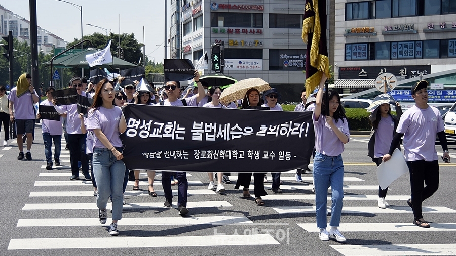 [뉴스앤조이-이용필 기자] 장로회신학대학교(임성빈 총장) 학생·교수 300여 명이 명성교회 세습 철회를 촉구하는 가두시위를 진행했다. 장신 공동체는 폭염주의보가 내린 5월 24일, 장신대에서 명성교회까지 '걷기도회'를 개최했다. '걸으면서 기도한다'는 뜻의 걷기도회는, 신대원 학우회·여학생회·총학생회, 명성교회세습철회와교회개혁을위한장신대교수모임(세교모)이 함께 기획했다.