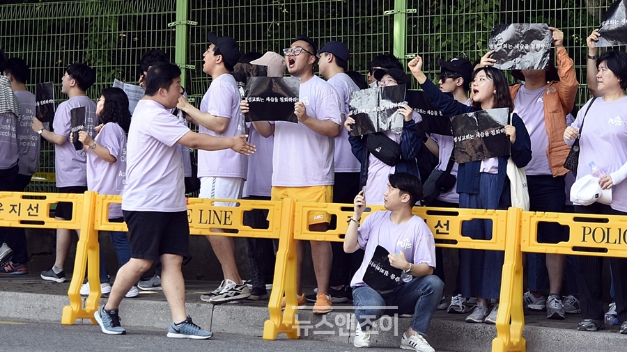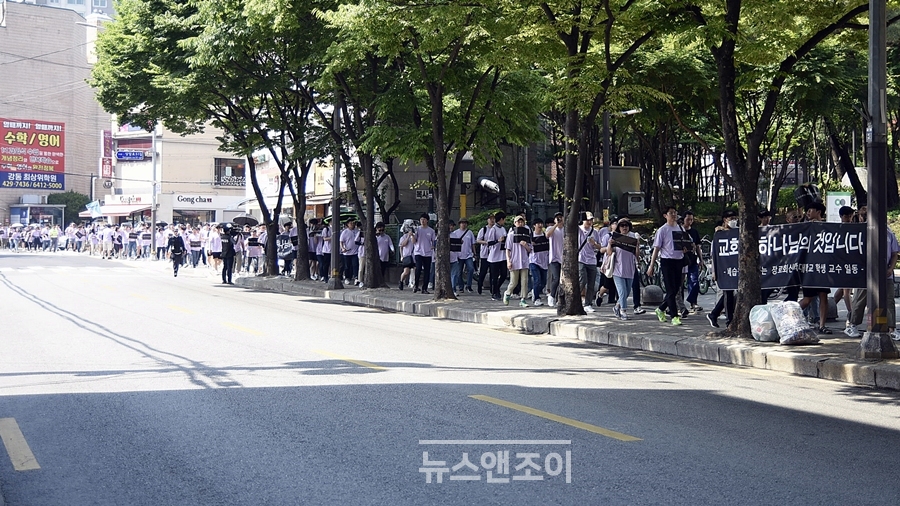 시작 전 학생들은 가볍게 스트레칭을 하며 몸을 풀었다. 걸음이 느린 인원을 선두에 배치하는 등 안전에 만전을 기했다. 12시 30분경, 미스바광장에 줄지어 선 학생들이 명성교회를 향해 발걸음을 뗐다. 미리 나와 있던 경찰은 학생들을 인도했다. 이날 체감온도는 최고 33도에 이르렀다. 10분도 안 돼 상의가 축축해졌다. 학생들은 종이로 만든 고깔모자, 수건, 양산 등을 준비해 왔다.