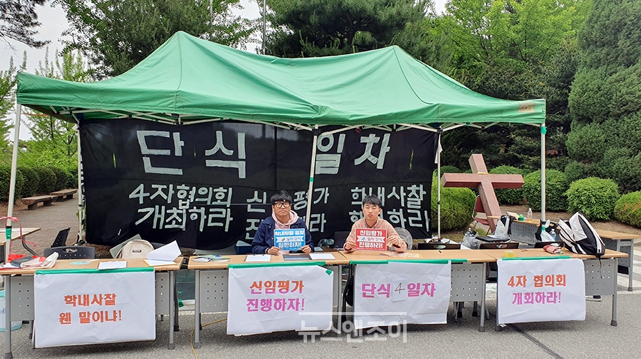 한신대 학생들은 사찰 의혹 해명을 촉구하며 무기한 단식에 들어갔다. 민족한신총학생회비상대책위원회(비대위) 이의석 위원장 등 5명은 5월 27일부터 한신대 장공관 앞에서 천막을 설치하고 단식 농성을 벌이고 있다. 이 위원장은 5월 30일 <뉴스앤조이>와의 인터뷰에서 "이번 사건은 총장이 직접 나서서 해명해야 한다. 학우들에게 학내 사찰 의혹을 알리며 서명을 받고 있다. 벌써 400여 명이 동참했다"고 말했다.