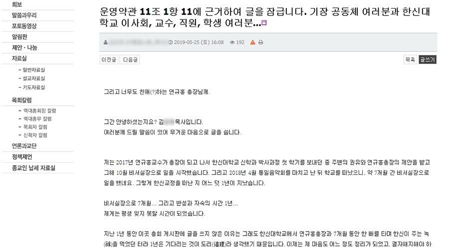 연 총장 전 비서실장 K 목사는 5월 25일 한국기독교장로회(기장·김충섭 총회장) 총회 홈페이지에 '기장 공동체 여러분과 한신대 이사·교수·직원·학생 여러분'이라는 제목으로 글을 올렸다. K 목사는 이 글에서 "연 총장의 업무 지시 중 가장 많은 부분이 학내 사찰이었다"고 주장했다. 그는 "연 총장이 주변 사람들을 믿지 않는다"며 "이사·교수·직원·학생은 물론 함께 일했던 처·실장까지 (사찰 대상에) 포함했다"고 썼다.