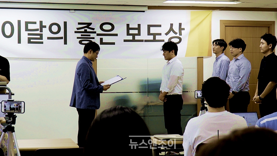 [뉴스앤조이-이용필 기자] 상賞과는 거리가 먼 <뉴스앤조이>가 민주언론시민연합(민언련) '이달의 좋은 보도상'을 수상했습니다. '명성교회 세습 사태 관련 보도', '우리 동네 교회 세습 지도'로 2019년 7월 온라인 부문 수상자로 선정됐습니다. 명성교회와 세습을 취재해 온 이용필·박요셉·최승현·장명성 기자는 8월 30일 민언련 사무실에서 상과 상패를 받았습니다.