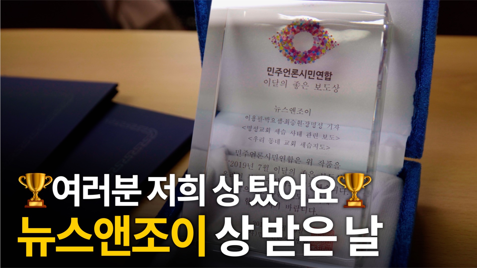 민언련 김언경 사무처장은 "<뉴스앤조이>는 오랫동안 기독교계 여러 가지 문제를 짚어 왔다. 이달의 보도가 아니라, 그동안 노고에 상을 드리고 싶다"고 말했다. 시상식 직후 열린 간담회에서는 이용필·최승현 기자가 △20년 동안 교회 개혁 움직임을 이어 온 이유 △교회 세습 지도를 만들게 된 계기 등을 설명했다. '<뉴스앤조이> 상 탄 날'을 영상에 담았다.