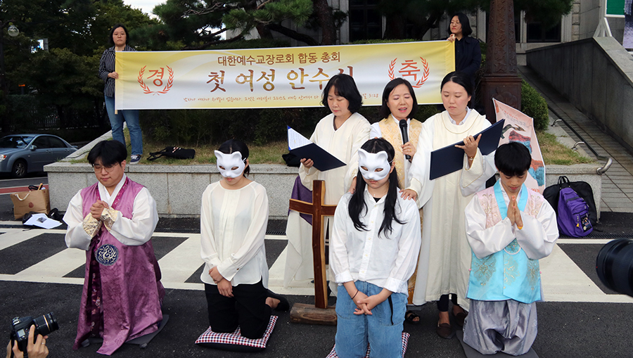 기독교반성폭력센터 '여성 목사 안수식' 퍼포먼스…총신 여동문회도 피켓 시위