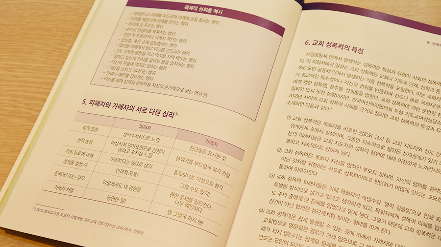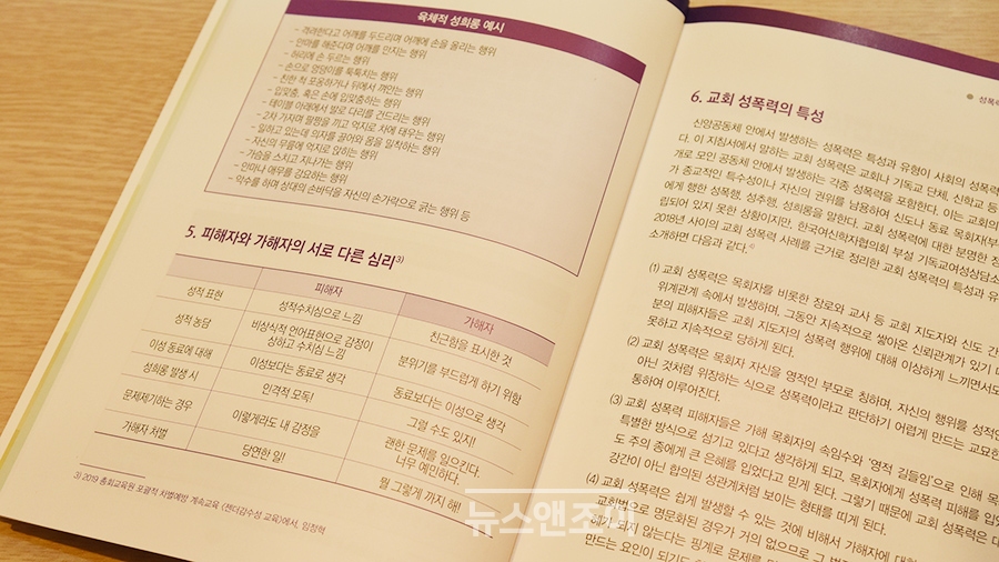 '교회 성폭력의 정의와 특성' 부분에는 성폭력 유형이 명시돼 있다. 지침서는 언어·육체적·시각·환경형 성희롱 등으로 나눠 구체적인 예시와 함께 설명했다. '몸매 진짜 좋다. 누가 보면 처녀인 줄 알겠어', '남자 전도사님이 그거 먹고 힘쓸 수 있겠느냐', '차는 젊은 여자가 타 줘야 제맛이지', '빨리 결혼해서 순풍순풍 애를 낳는 것이 자연 전도다'는 등의 표현을 언어 성희롱 예로 들었다.