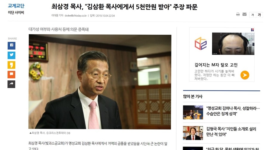 이 글이 나간 지 한 달이 지난 시점, 갑자기 <크리스천투데이>가 이를 물어뜯기 시작했다. 글의 주제와 아무 상관없이, '금품 수수'와 같은 표현을 써 가며 대가성 의혹을 제기했다. '논란', '파문', '충격'과 같은 단어를 헤드라인으로 뽑았으나, 10월 4일부터 15일까지 최 목사와 관련한 글 11개 중 새로운 팩트나 증거를 제시하는 기사는 한 개도 없었다.