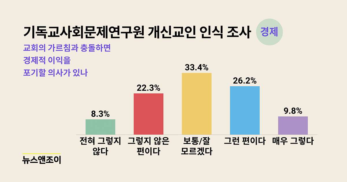 마지막으로 "경제적 이익을 극대화하기 위해 선택해야 하는 행동(주식, 부동산 투자 등)이 성경 혹은 교회의 가르침과 충돌할 경우, 신앙 양심을 지키기 위해 경제적 이익을 포기할 의향이 있는가" 물었다. 응답자 30.6%가 그렇지 않다고 응답했고, 36%가 그렇다고 응답했다. 잘 모르겠다는 응답은 33.4%였다.