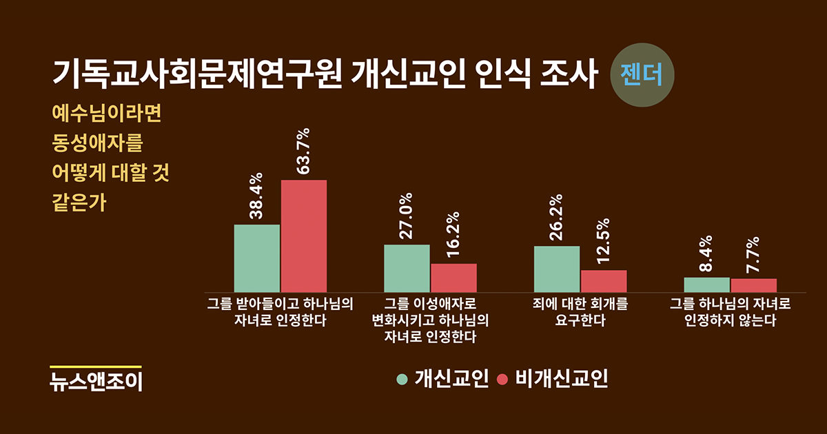 "예수님이라면 동성애자를 어떻게 대할 것 같은가"라는 질문에, 비신자가 더 포용적 입장을 보였다. '그의 동성애를 받아들이고 하나님의 자녀로 인정한다'는 항목을 개신교인은 38.4%만 선택한 반면, 비신자는 63.7%가 선택했다. '그를 이성애자로 변화시키고 하나님의 자녀로 인정한다'는 항목은 개신교인 27%, 비신자 16.2%가 선택했다. '그에게 죄에 대한 회개를 요구한다'는 개신교인 26.2%, 비신자 12.5%가 나왔다. '그를 하나님의 자녀로 인정하지 않는다'는 응답은 개신교인 8.4%, 비신자 7.7%로 나타났다. 계층별로는 목회자 그룹(21.4%)에서 제일 높았다.