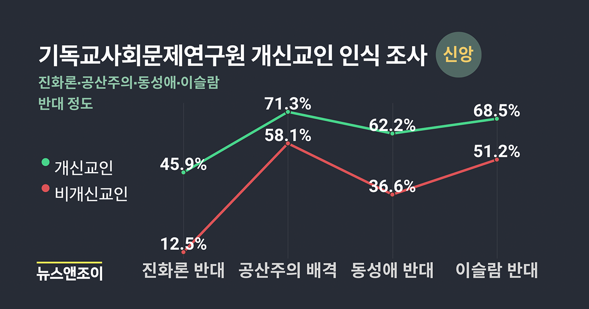 개신교인 응답자는 진화론 반대(45.9%), 공산주의 배격(72%), 동성애 반대(62.3%), 이슬람 반대(68.4%) 결과가 나온 반면, 비신자 응답자는 진화론 반대(12.5%), 공산주의 배격(58.1%), 동성애 반대(36.6%), 이슬람 반대(51.2%) 응답을 보였다.