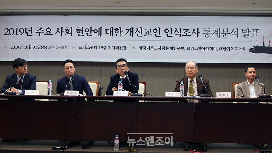 [뉴스앤조이-최승현 기자] 한국기독교사회문제연구원(기사연·김영주 원장)이 10월 31일 프레스센터에서 '2019 주요 사회 현안에 대한 개신교인 인식 조사 통계 분석'을 발표했다. 개신교인 1000명, 비신자 1000명을 대상으로 신앙·정치·경제·젠더·통일·환경 등 6개 분야를 설문 조사한 결과다.
