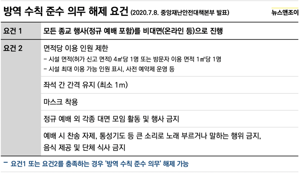 전날 발표한 '핵심 방역 수칙 준수 의무' 해제 요건과 관련해서는, 모든 종교 행사를 비대면으로 진행하거나(요건1), 이용 인원을 엄격히 제한하는 등 감염 위험도를 낮출 수 있는 추가 방역 조치(요건2)를 자발적으로 이행·준수하는 경우 지방자치단체장(시장·군수·구청장) 판단에 따라 행정명령 대상에서 제외될 수 있다. 개별 교회가 위 요건 중 하나를 충족할 경우 관할 시·군·구에 알리고 해제를 요청할 수 있다.