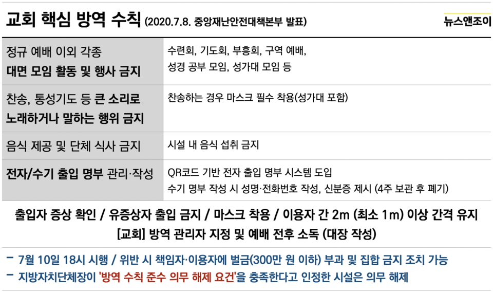 [뉴스앤조이-최승현 기자] '교회 정규 예배 외 각종 모임 금지' 방안을 놓고 교계 반발이 거세다. 정부는 7월 9일 이와 관련해 '교회 방역 강화 조치 관련 FAQ'를 내놓고 '정규 예배 범위' 등을 추가로 안내했다.