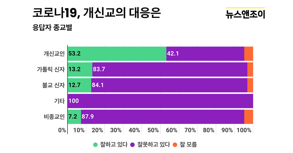 응답자들을 종교별로 나누어 보면 결과는 더욱 심각하다. 개신교인들은 56.9%가 '교회가 잘하고 있다'고 응답한 반면, 무종교인들은 8.8%만이 '교회가 잘 대응하고 있다'고 응답했다. 가톨릭 신자(14.3%)나 불교 신자(10%)들도 낮은 응답을 보여, 개신교인과 비개신교인 간 현격한 인식 차를 드러냈다.