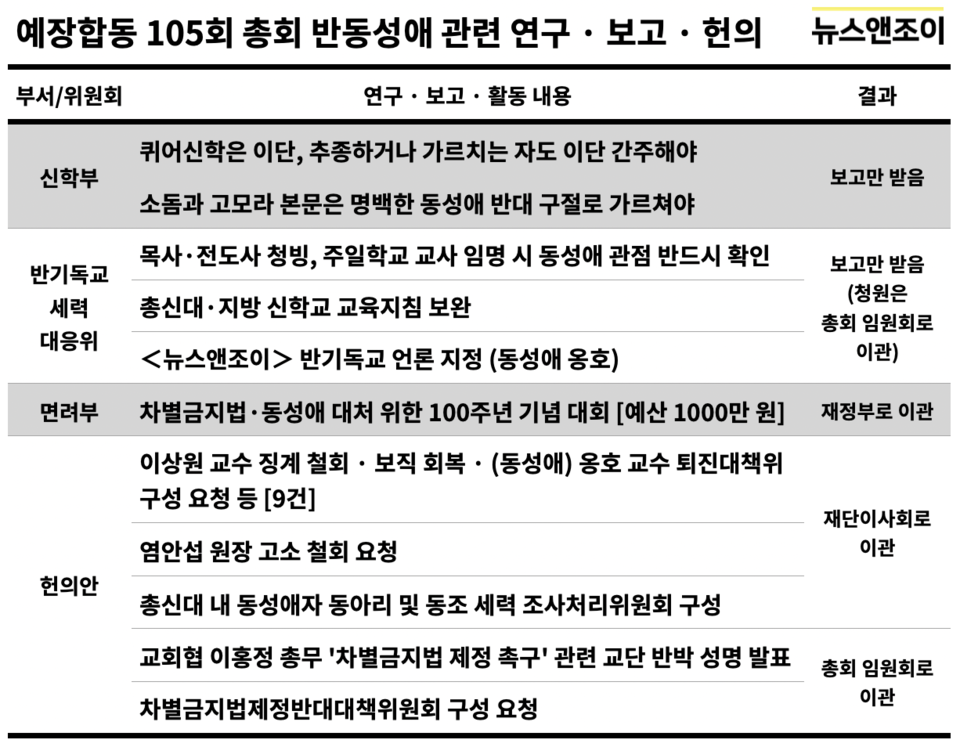 [뉴스앤조이-최승현 기자] 한국교회에서 가장 규모가 큰 대한예수교장로회 합동(예장합동·소강석 총회장) 105회 총회에서는 올해도 반동성애 기조를 강화해야 한다는 보고가 이어졌다.