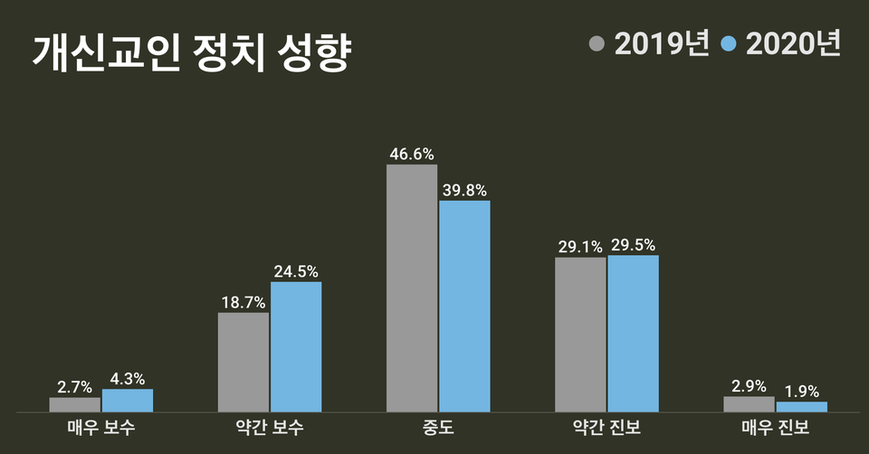 구체적인 정치 성향은 매우 보수 4.3%, 약간 보수 24.5%, 중도 39.8%, 약간 진보 29.5%, 매우 진보 1.9%로 나타났다. 2019년 조사에서 개신교인들 정치 성향은 보수 21.4%(매우 보수 2.7%, 약간 보수 18.7%), 중도 46.6%, 진보 32%(약간 진보 29.1% 매우 진보 2.9%)로 나왔다.