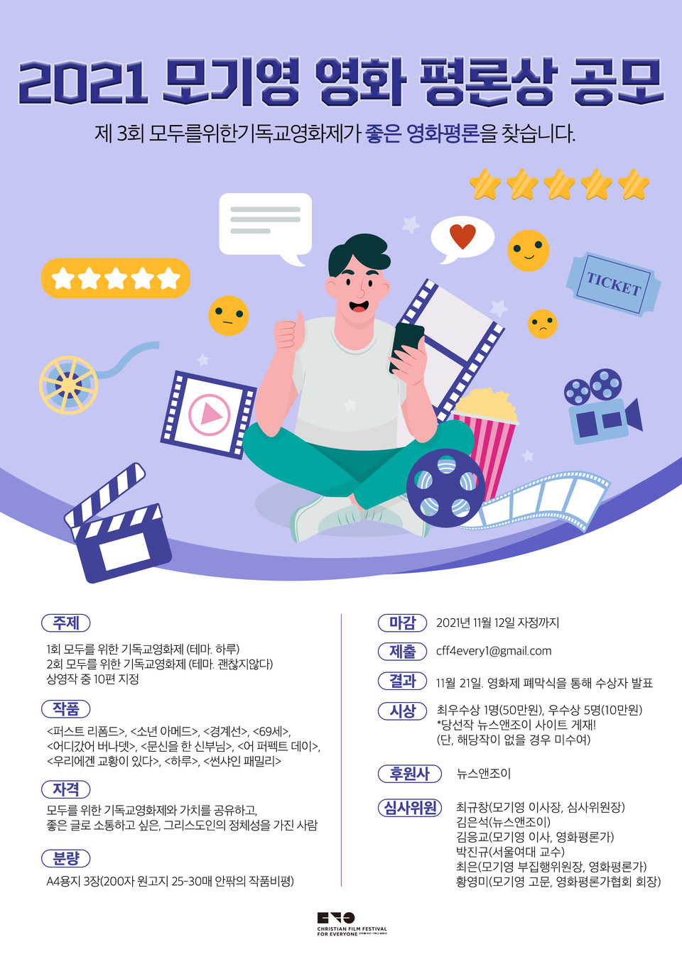 응모를 원하는 분은 위 영화 가운데 한 편을 보고 A4 용지 3장 분량의 평론을 작성해 이메일(cff4every1@gmail.com)로 제출하면 됩니다. 모기영의 가치에 공감하고 좋은 글로 소통하길 원하는 그리스도인 누구나 응모 가능합니다. 마감 기한은 11월 12일 자정입니다.