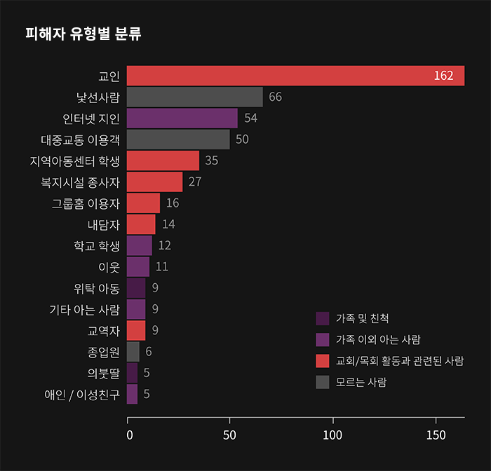 <뉴스앤조이>는 피해자와 가해자의 관계를 △교회·목회 활동과 관련된 사람 △가족 및 친척 △가족 및 친척 이외의 아는 사람 △전혀 모르는 사람 등 4개 그룹으로 분류했다.