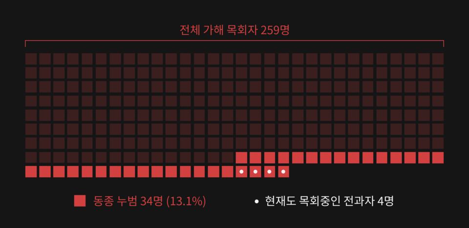 가해 목회자 259명 중 34명(13.1%)은 이미 성범죄 전과가 있는 '동종 누범'이었다. 특히 조 아무개 목사(243·244·245번)는 불법 촬영, 음란 메시지 전송 등으로 전과만 6회에 달했다. 상담사로도 일했던 강영민 목사(4·5번)는 2012년 강간 미수로 징역형을 선고받았다. 그는 출소 후에도 반복적으로 성범죄를 저질렀다. 2016년 내담자들을 강제 추행해 징역 3년을 선고받고 복역한 후, 2021년 또다시 강제 추행을 저질러 현재까지 복역 중이다. 경남 창원에서 목회하는 송 아무개 목사(163·164·165번)는 2012년부터 공연음란죄로 벌금형을 3회, 징역형을 1회 선고받았지만 현재도 목회를 계속하고 있다.