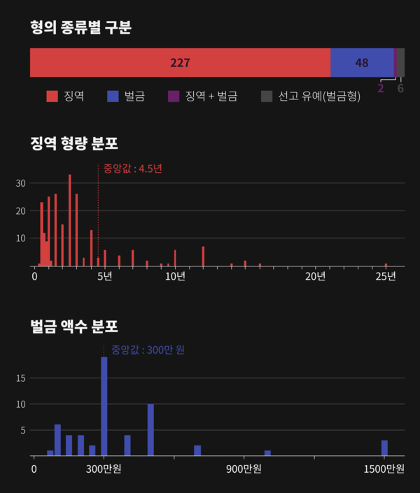 가해 목회자들이 받은 형량은 최소 4개월부터 최대 25년까지 다양했다. 교인들을 상대로 엽기적인 행위를 일삼아 사회적 물의를 일으킨 '안산 구마교회 사건' 가해자 오다윗 목사(170번)는 징역 25년을 선고받았다. 오 목사는 20년 전 기독교대한하나님의성회(기하성)에서 사이비 논란으로 제명된 바 있다. 주요 교단이 이단·사이비로 규정한 만민중앙교회 이재록 목사(202번)는 징역 16년을 선고받았다.