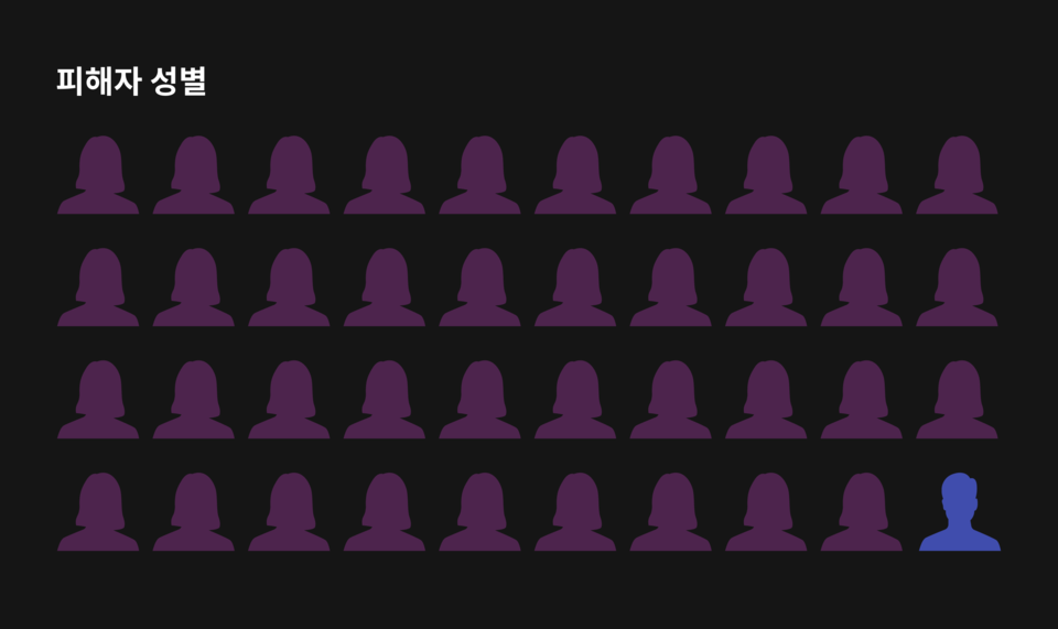 피해자 성별은 여성이 515명(97.4%)으로, 남성 12명(2.3%)보다 압도적으로 많았다. 성별을 알 수 없는 피해자도 2명 있었다. 총 529명의 피해자 중 240명(45.4%)은 만 18세 미만 미성년자였으며, 20대까지 더하면 396명(74.9%)에 달했다.