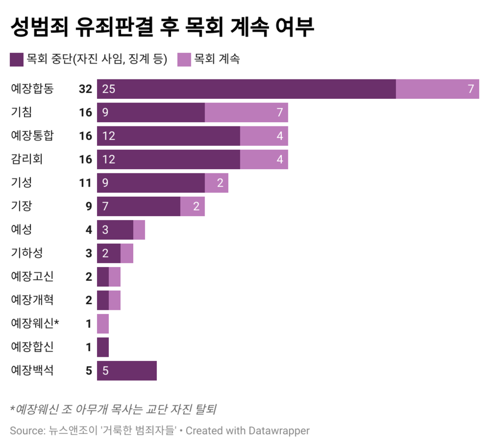 현재 교단 시스템상 소속 목회자가 구속되거나, 스스로 범죄 사실을 밝히지 않는 이상 교단이 이를 파악하기는 어렵다. 하지만 교단이 소속 목회자의 유죄판결 사실을 알고도 징계하지 않는 경우도 많았다. 이럴 경우 가해자들은 아무런 문제도 없었다는 듯 목회를 이어 갈 수 있었다.