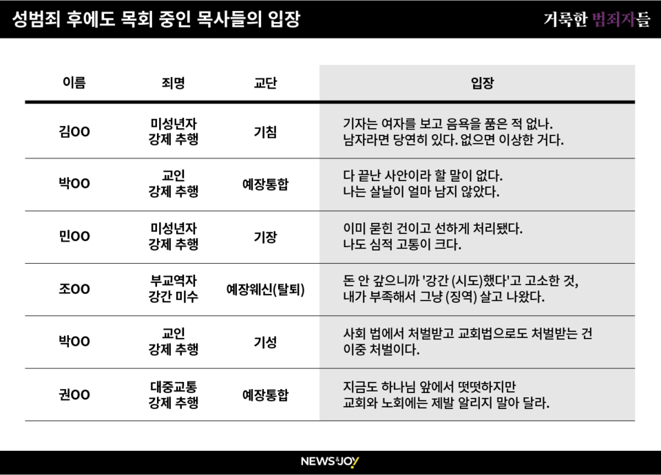 <뉴스앤조이>는 성범죄를 저지른 목회자들이 어떤 과정을 거쳐 강단에 복귀했는지, 자신의 범죄행위에 대한 입장은 어떠한지 듣기 위해 교회에 직접 찾아가거나 연락을 취했다. <뉴스앤조이>가 접촉한 목회자(아내 포함) 12명의 반응은 대부분 비슷했다. "이미 지나간 일인데 뒤늦게 들춰내려 한다"며 불쾌해하거나, "애당초 그런 일은 없었고, 음해와 모함으로 법원에서 유죄를 선고받았을 뿐"이라며 오히려 피해자 행세를 하기도 했다. 드물게 잘못을 반성하는 목사도 있었지만, 자신의 범죄 사실이 가족과 교회·교단에 알려지지 않기를 바랐다.
