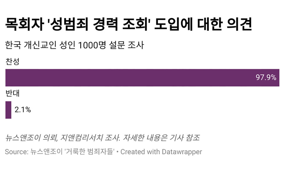목회자들을 대상으로 한 '성범죄 경력 조회 제도' 도입에는 97.9%가 찬성한다고 응답했다. 찬성 이유(1순위+2순위)로는, '성범죄 경력자의 사역을 막기 위해'(64.2%), '목회자도 아동·청소년을 상대하는 사람이기 때문에'(57.3%)가 높은 응답을 차지했다. 사회 주요 시설에서 시행하고 있는 제도와 마찬가지로 교회도 성범죄자의 유입과 사역을 원천 차단해야 한다고 본 것이다. '교단 자체 시스템으로는 성범죄자를 걸러 내기 어렵기 때문에'(35.9%), '교회의 사회적 신뢰 회복을 위해'(22.6%), '교회와 성직자에 대한 교인들의 신뢰 증가를 위해'(19.7%)라는 응답이 뒤를 이어, 교단 시스템과 교회·성직자에 대한 불신도 성범죄 경력 조회가 필요하다는 의견에 영향을 준 것으로 나타났다.