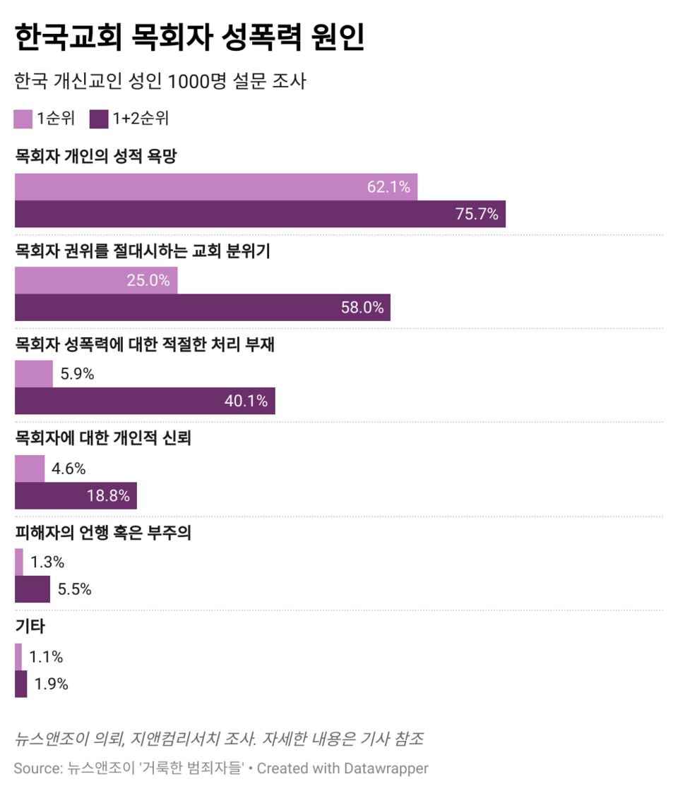 전체 응답자 중 89.1%는 한국교회 내에서 발생하는 목회자 성폭력에 대해 직간접적으로 들은 바 있는 것으로 나타났다. 응답자들이 꼽은 교회 내 목회자 성폭력이 일어나는 원인(1순위+2순위)은 '목회자 개인의 성적 욕망'(75.7%), '목회자의 권위를 절대시하는 교회 분위기'(58%), '성폭력 목회자에 대한 적절한 처리 부재'(40.1%) 순이었다. 이는 응답자들이 대체로 목회자 성범죄를 가해 목회자 개인의 도덕성에 기인한 문제로 바라보고 있다는 것을 시사한다. 그럼에도 목회자에게 권력이 집중된 교회 문화와 미비한 대처 시스템 등 구조적인 문제 또한 주요 원인이라는 인식도 갖고 있음을 보여 준다. '목회자에 대한 개인적 신뢰'(18.8%), '피해자의 언행 혹은 부주의'(5.5%) 등이 원인이라며 책임을 성폭력 피해자에게 돌리는 시각도 있었다.