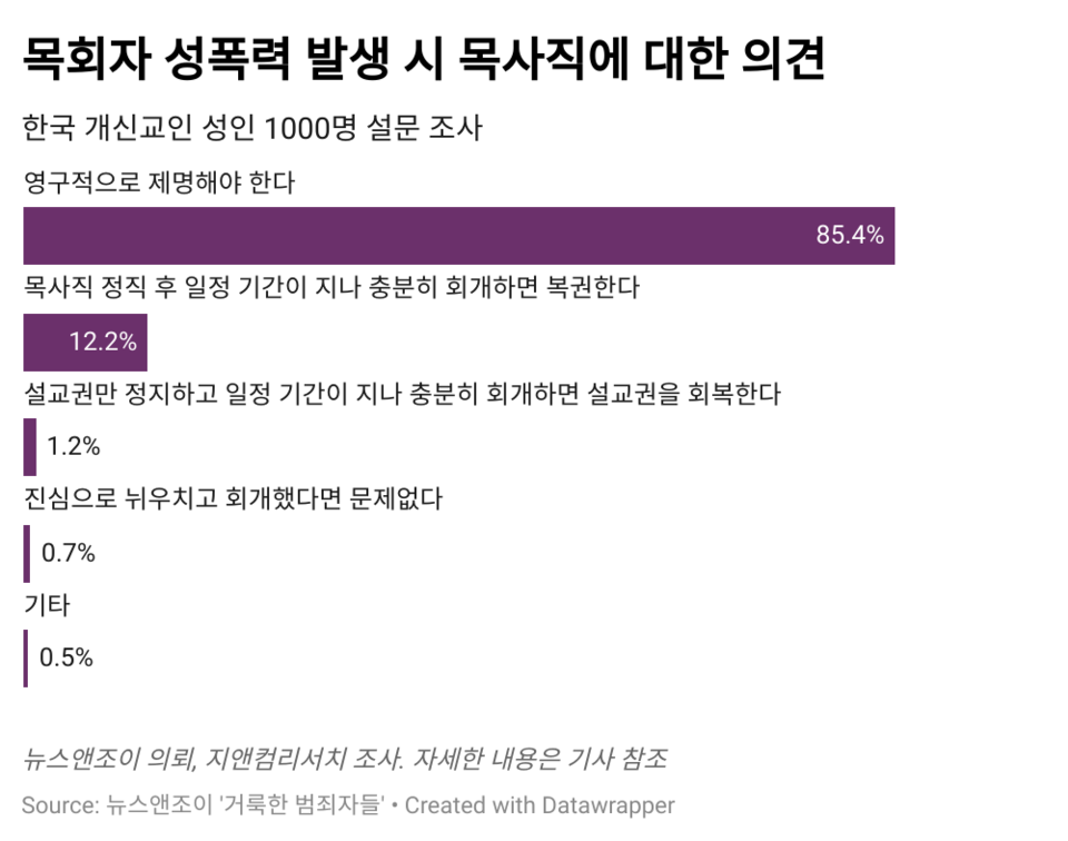 응답자 대다수는 성범죄 가해 목회자를 엄격히 처벌해야 한다고 했다. '가해자를 영구적으로 제명 조치해야 한다'는 응답은 85.4%에 달했다. 일정 기간 '정직' 혹은 '설교권 정지' 후 회개하면 복권할 수 있다는 비율은 전체 응답자의 13.4%에 그쳤다. 이 경우, '자숙 기간은 최소 2년 이상이 지나야 한다'는 응답이 59.7%를 차지했다. '성범죄 당사자가 진심으로 뉘우치고 회개했다면 문제 될 것 없다'는 응답 비율은 0.7%로 미미했다.
