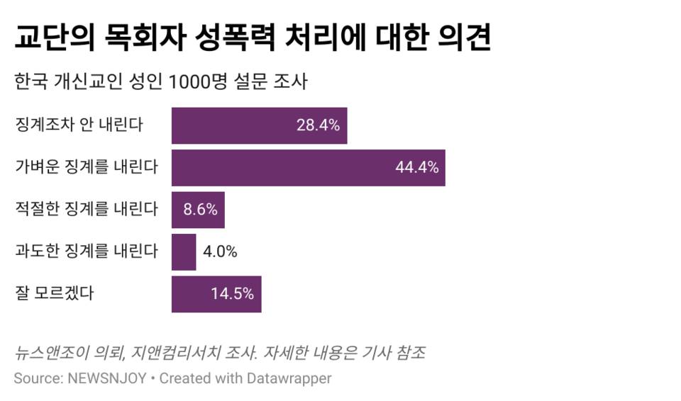 '한국교회가 성범죄 목회자에게 적절한 징계를 내리고 있다'고 응답한 비율은 8.6%에 그쳤다. 응답자 중 44.4%가 '가벼운 징계를 내린다'고 응답했고, 28.4%가 '징계조차 내리지 않는다'고 했다. 다시 말해, 응답자 중 72.8%는 한국교회가 목회자 성폭력에 제대로 대처하지 못하고 있다고 본 것이다. <뉴스앤조이>가 지난 10년간 성범죄로 유죄판결을 받은 목회자 259명을 취재한 결과, 신원이 파악된 목회자 133명 중 교단에서 징계를 받은 목회자는 26명으로 19.5%였다.