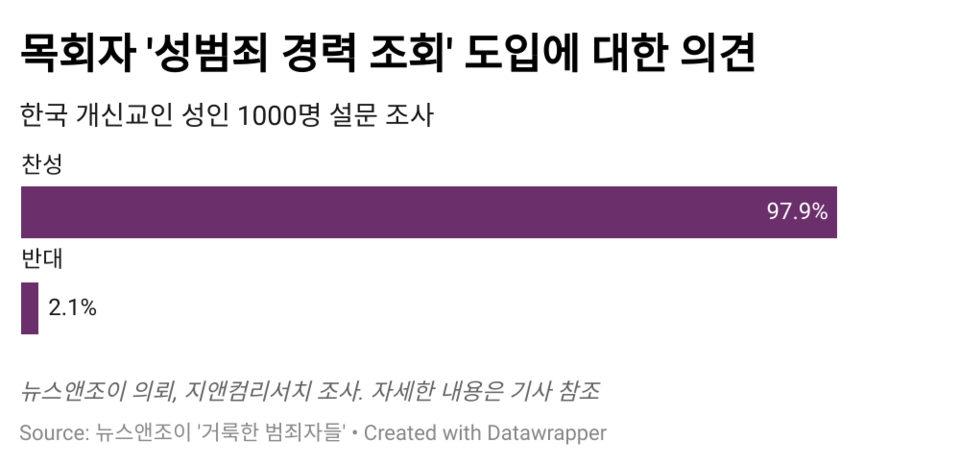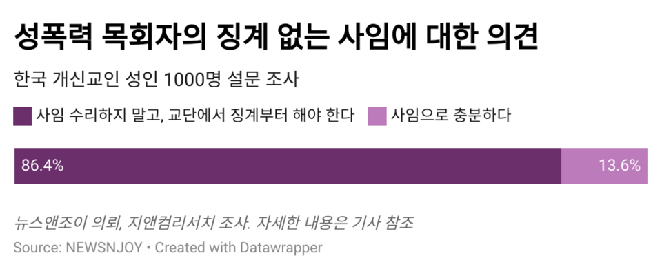 | 성범죄 목회자 영구 제명해야 85.4% 징계 없는 사임 안 돼 86.4% 처리 과정 모두 공개해야 81.4% |