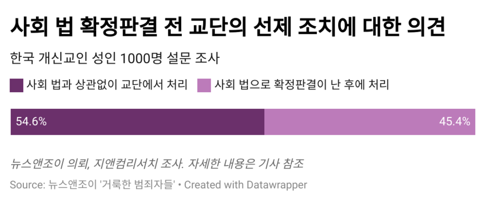 응답자들의 의견이 갈리는 문항도 있었다. 목회자 성폭력 사건 발생 시 '사회 법 확정판결과 상관없이 교단에서 먼저 조치를 취해야 한다'(54.6%)는 응답과, '사회 법 확정판결 이후에 처리해야 한다'(45.4%)는 응답으로 의견이 나뉜 것이다.
