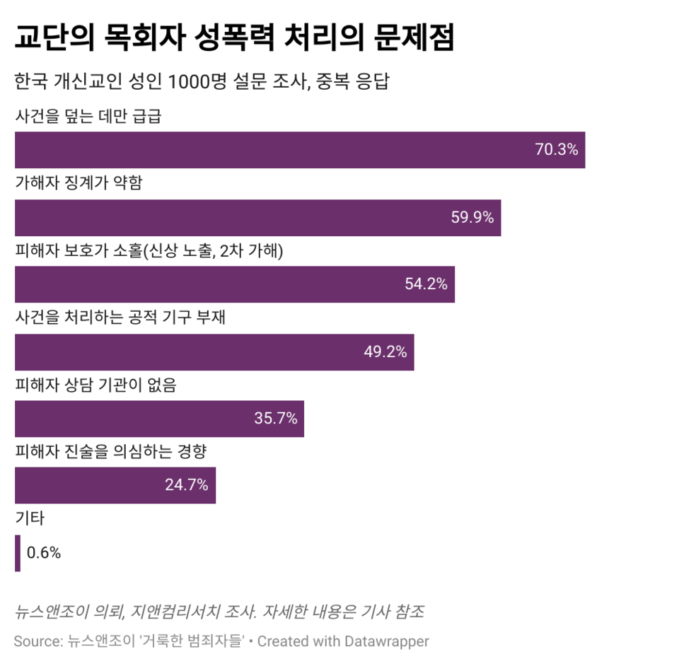 한국교회 목회자 성폭력에 대한 개신교인 인식 조사…72.8% "목회자 성범죄 처리 잘 안 되고 있다"