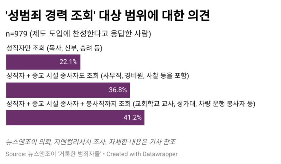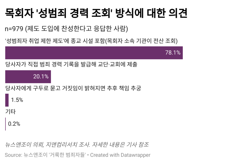 응답자 중 41.2%는 목회자뿐만 아니라 '봉사직(교회학교 교사, 차량 봉사자, 성가대 등)에도 성범죄 경력 조회 제도를 적용해야 한다'고 응답했다. '목회자를 포함한 교회 내 근무자(사무직, 경비원, 사찰)까지 적용해야 한다'는 응답은 36.8%였다. 목회자에 대한 성범죄 경력 조회 시기에 대한 응답은 '1·5·10년 등 일정 주기마다 조회'(65.2%), '교회 청빙 시 조회'(15.2%), '목사·강도사 고시 때 한 번만 조회'(12.1%), '교단 주요 임원 입후보 시 조회'(7.1%) 순이었다.