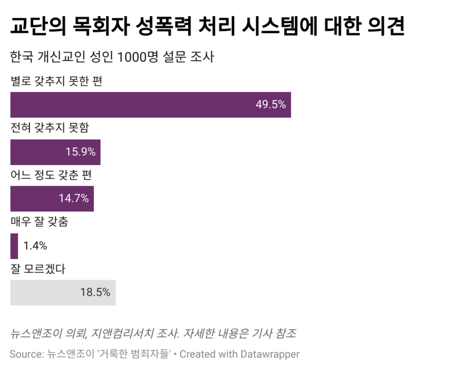 | 교인들은 잘 모르는 교단 성폭력 처리 규정·시스템 '매우 잘 갖추고 있다' 1.4% |