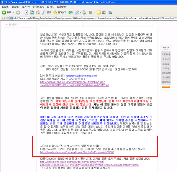 이들은 6월 7일 성명서를 발표해, 국민연합의 에스비에스 시청 거부 운동이 '종교의 편협한 논리로 예술 창작 활동의 권리와 시청권을 박탈하는 행위'라고 지적하며 '국민 기본권에 대한 이해를 결여한 몰상식의 소치'라고 했다. 또 신앙과 성경을 폭력의 도구로 사용하는 것은 용서하기 어려운 범죄 행위라고 했다. 편협한 잣대로 신의 생기로 창조된 인간을 혐오스러운 존재로 전락시키는 것은 범죄라는 것이다. 차세기연은 국민연합이 지난 2007년 차별금지법 제정을 무산되게 하고, 동성애 혐오증에 입각한 활동으로 기독교 신앙의 본질과 종교의 사회적 공공성 기능을 심각하게 훼손하는 잘못을 범했다고 지적했다.