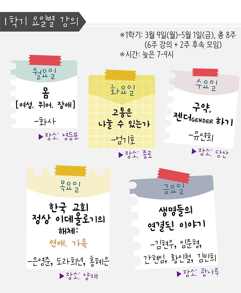 - 1학기 강좌 주제가 다양하다. 월요일부터 금요일까지 몸, 고통, 구약, 연애·가족, 생태·동물권·비건·탈핵·기후 등을 다룬다. 이렇게 강좌를 구성한 의도가 있다면.