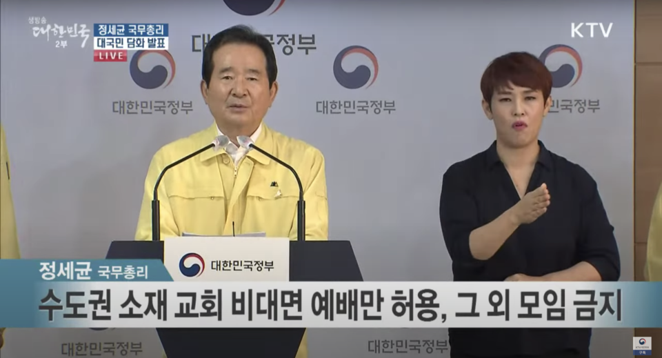 [뉴스앤조이-최승현 기자] 정부가 8월 19일부터 사회적 거리 두기 2단계를 시행하고, 수도권 교회들에는 온라인 예배만 허용하기로 했다. 정세균 국무총리는 18일 대국민 담화에서 "수도권 소재 교회는 비대면 예배만 허용하고, 그 외 모임과 활동은 금지된다. 교계의 넓은 이해를 부탁드린다"고 말했다.