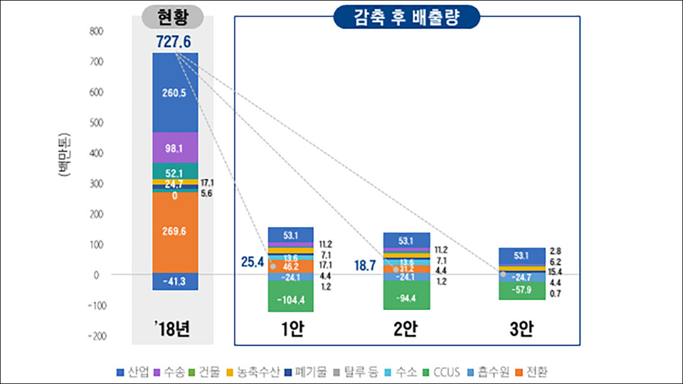 2018년 기준 한국의 온실가스 배출량은 7억 2760만 톤이다. 이는 세계 11위에 해당하는 수치다. 대기 중 누적 배출량도 13위다. 특히 인구 1명당 배출하는 탄소량은 세계 평균 4.4톤의 2.5배인 11.8톤이나 된다. 탄중위 시나리오 1·2·3안은 2050년까지 온실가스 배출량을 각각 96.5%, 97.4%, 100% 감축할 수 있다고 전망한다.