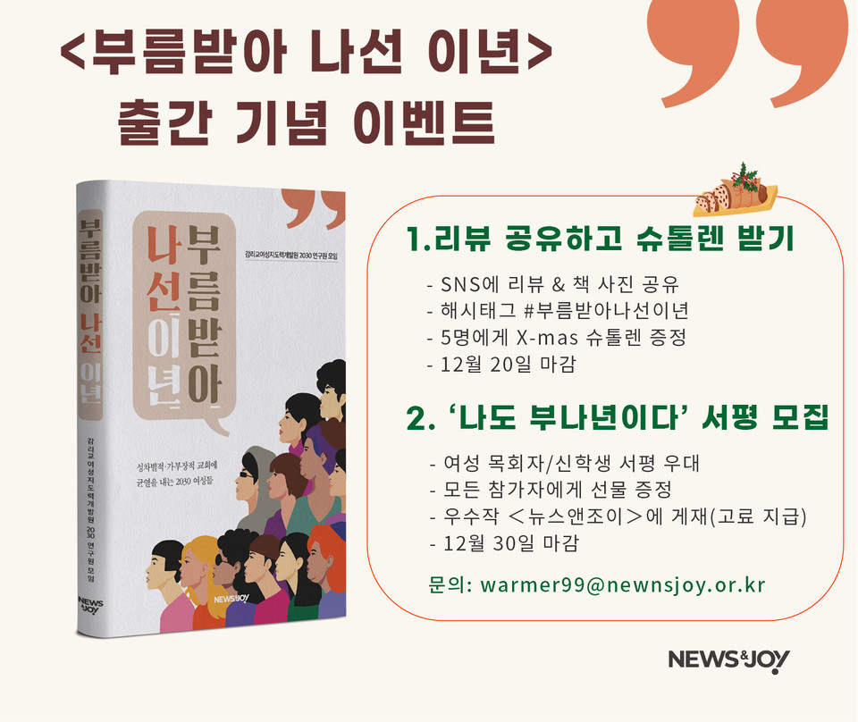<부름받아 나선 이년>을 읽고 A4 2~3매(한글 기본 서식 기준, 원고지 16~24매) 안팎의 서평을 작성해 warmer99@newsnjoy.or.kr로 보내 주세요. 열두 명의 공저자들처럼 신학교나 목회지 또는 사역 현장에서 겪은 차별과 배제의 경험을 녹여 낸 여성 목회자‧신학생의 서평을 특히 환영합니다. '말하면 균열을 낼 수 있다'는 믿음으로 자신의 이야기를 풀어 낸 감리교여성지도력개발원 열두 연구원처럼 자신의 경험을 이야기로 발화하는 여성들이 계속 많아지길 기대합니다. 서평을 보내 주신 분들께는 텀블벅 리워드로 제작한 '부름받아 나선 이년' 말씀 카드 세트, 감리교여성지도력개발원 20주년 출판위원회에서 만든 책 <언니들의 뜰밖 기도>를 보내드리겠습니다(15명 한정). 접수된 서평 중 우수작 두 편을 선정해 <뉴스앤조이> 사이트에 게재하고 서평자께 원고료(7만 원)를 드리겠습니다. 접수 마감일은 12월 30일입니다.